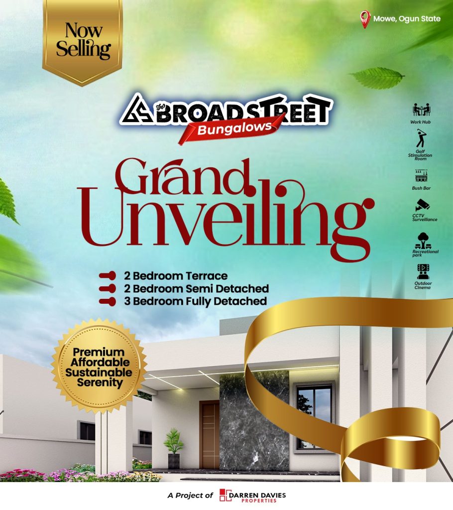 The wait is over! We are thrilled to announce the official launch of the Broadstreet Bungalow development. These are not your typical properties; each Broadstreet Bungalow is a masterpiece of modern design and efficient space. Located in the highly sought-after Mowe, Ogun State, you’ll enjoy serene community living, 24/7 Electricity and Security with seamless access to RCCG Camp, Sagamu Interchange, MFM Camp, Muritala International Airport. Whether you are a first-time homeowner, an investor, or looking to downsize, the Broadstreet Bungalow offers a unique blend of comfort, style, and value. Availability is extremely limited. Click below to explore floor plans, pricing, and book your private viewing today!